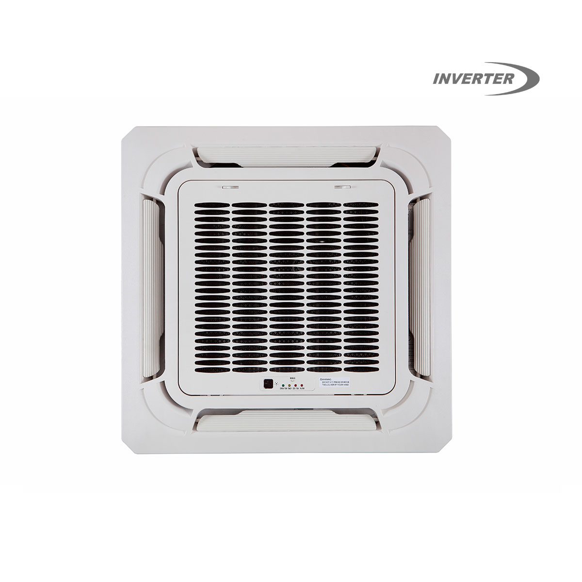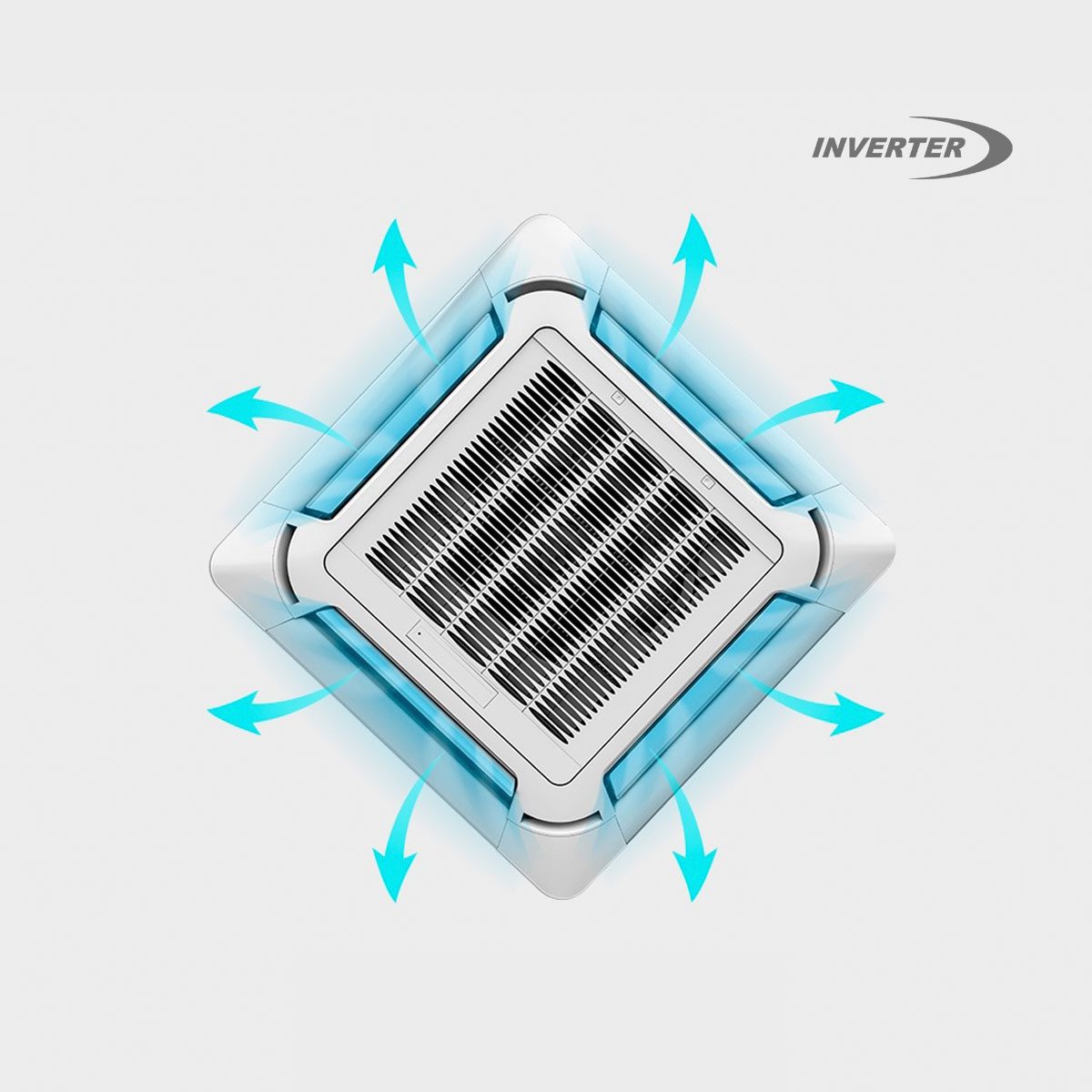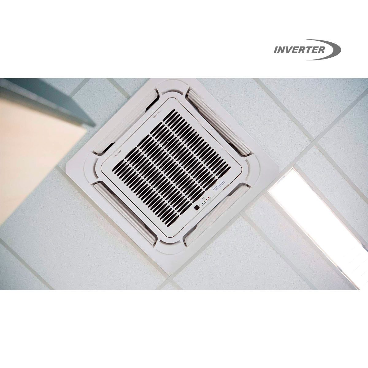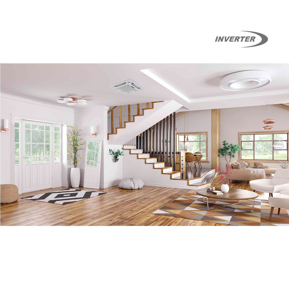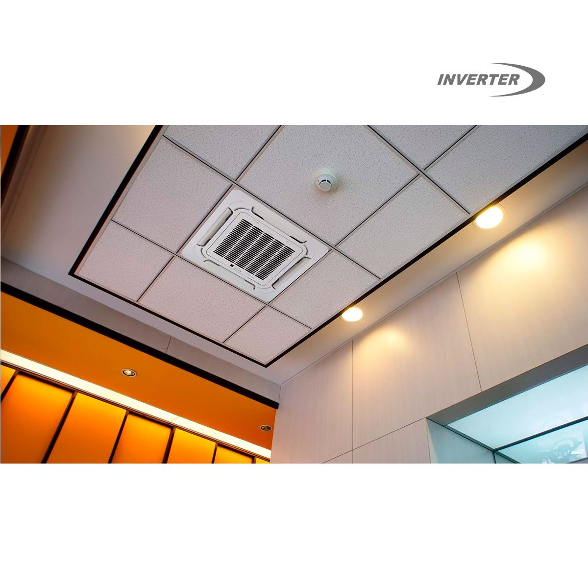 Diseño compacto compatible con módulos de cielorraso tipo Armstrong reduce el costo de instalación notablemente. Muchas veces no es fácil ubicar una unidad interior de pared para que distribuya bien el aire sin hacer cambios en el mobiliario. Los equipos tipo cassette van instalados en el cielorraso por lo que tienen una óptima distribución del aire sin quitarle espacio de almacenamiento u obligarlo a mover el mobiliario en pequeñas y grandes superficies. Un equipo ideal para salas de estar, livings y oficinas, al quedar embutidos y no ocupar lugar en las paredes. Por su diseño brindan óptima distribución de aire y contiene una bomba de desagüe de fácil instalación.